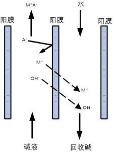 堿回收擴散滲析過程以濃差為驅動力,利用陽離子交換膜對堿的選擇透過性和對鹽或其它組分的高截留性,實現(xiàn)溶液中堿與鹽或其它組分的分離,分離出的堿溶液回用于生產(chǎn)工藝。